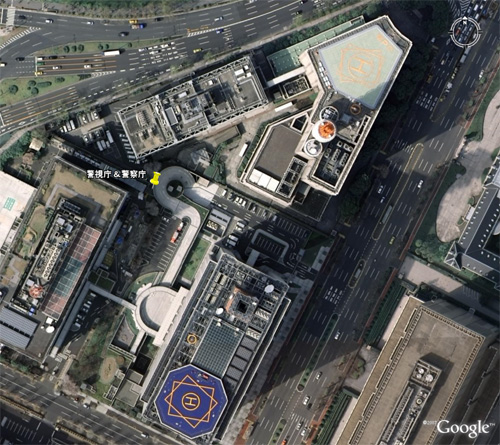 上部の変な形してるのが警視庁(左に繋がってる四角は国会図書館支部警視庁図書館)で下部の四角いのが警察庁が入ってる中央合同庁舎(たぶん第二庁舎)です。